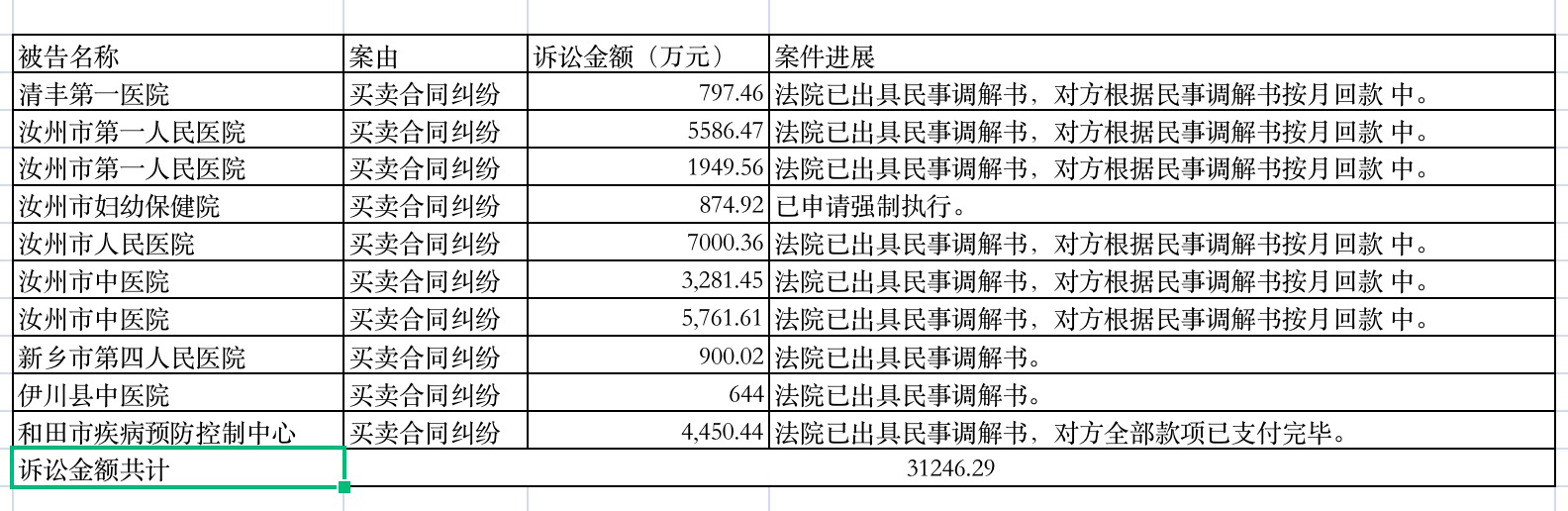 其中,公司及控股子公司作为原告或申请人涉及的诉讼合计金额约为人民币4.86亿元;公司及控股子公司作为被告或被申请人涉及的诉讼案件合计涉案金额为人民币4836.27万元。