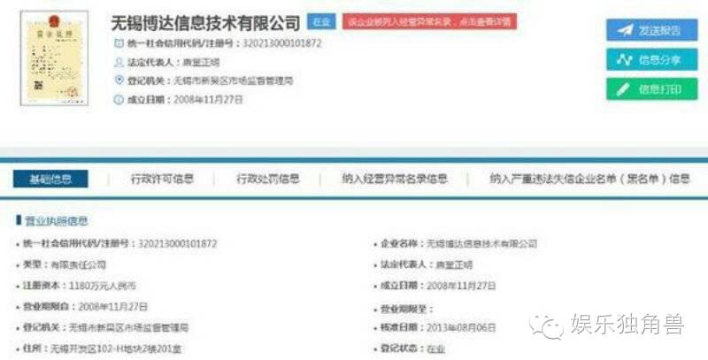 这两家公司都处于在业状态,其经营范围也符合孔奇涉及的运营商业务,不过,无锡博达虽然在业,但已经被列入了经验异常名录。
