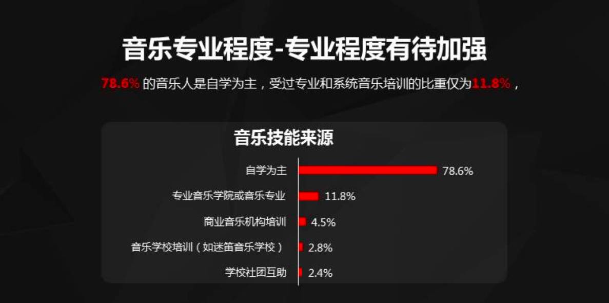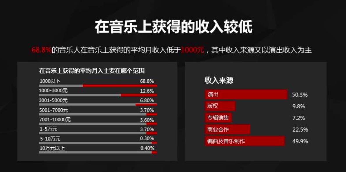 从此次调查结果看,大部分音乐人的生存状况仍不够乐观。高达84.3%的人是兼职做音乐,因为大部分音乐人无法只通过音乐相关的工作获得生活来源。调查数据显示,有68%的音乐人,在音乐上获得的平均月收入在1000元以下,而月音乐收入在1万以上的音乐人,占比才不到5%。