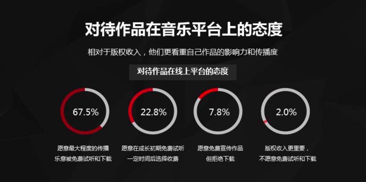 在对于影响自己作品发展的因素判断中,被提及最多的是作品的曝光机会,有近67.5%的用户表示,为了作品能够被最大程度的传播,他们愿意作品被免费试听和下载。可见,相对于版权收入来说,音乐人更看重作品的影响力和传播度。