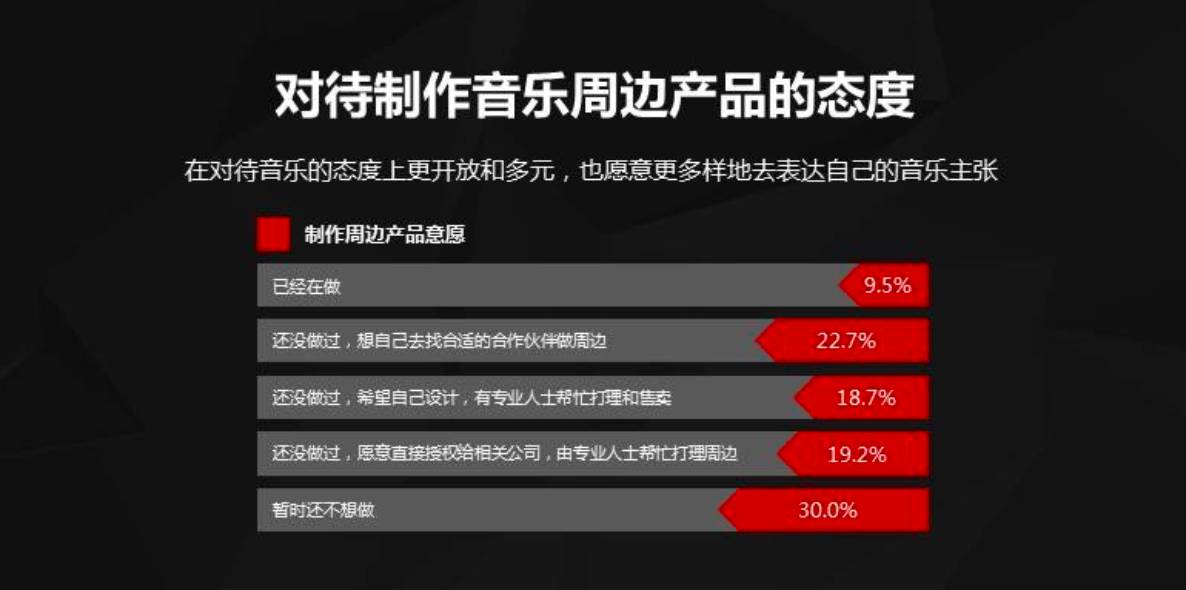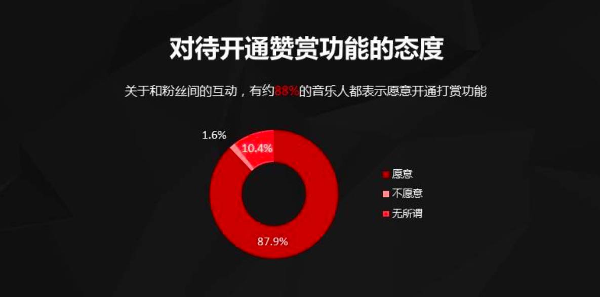 相较于传统音乐产业,如今的独立音乐在收益模式上大不相同,从版权方面能够大量获益的只占极少数,更多人依赖演出、周边产品等获得收入,而这些收入的多少也与音乐人的能力及知名度直接挂钩。88%的音乐人表示愿意开通打赏功能,70%的音乐人有意愿或已经在从事音乐周边产品,都说明他们致力于拓宽收入渠道,希望通过具有更高溢价能力的方式获得收入。