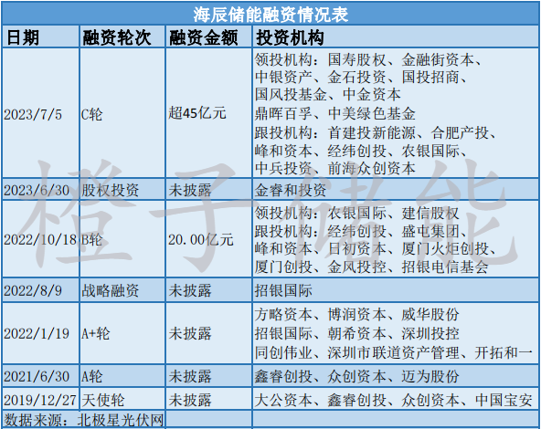 橙子储能整理发现,7月5日,海辰储能完成C轮投资、总额高达45亿元以上。本轮投资阵容十分奢华:国寿股权和金融街资本共同领投,中银资产、金石投资、国投招商等联合领投,多个资本跟投。海辰储能表示,本轮融资将用于相关设备采购、产能扩建、技术研发、市场开拓等。