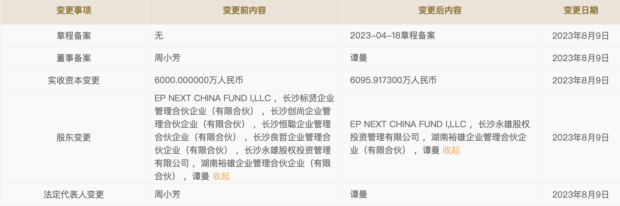 持股股东方面,由8名股东减少至4名,长沙标贤企业管理合伙企业(有限合伙) 、长沙创尚企业管理合伙企业(有限合伙) 、长沙恒聪企业管理合伙企业(有限合伙) 、长沙良哲企业管理合伙企业(有限合伙) 等4个员工持股平台股东退出。留下的4名股东分别是谭曼、湖南裕雄企业管理合伙企业(有限合伙)、长沙永雄股权投资管理有限公司、EP NEXT CHINA FUND I,LLC。