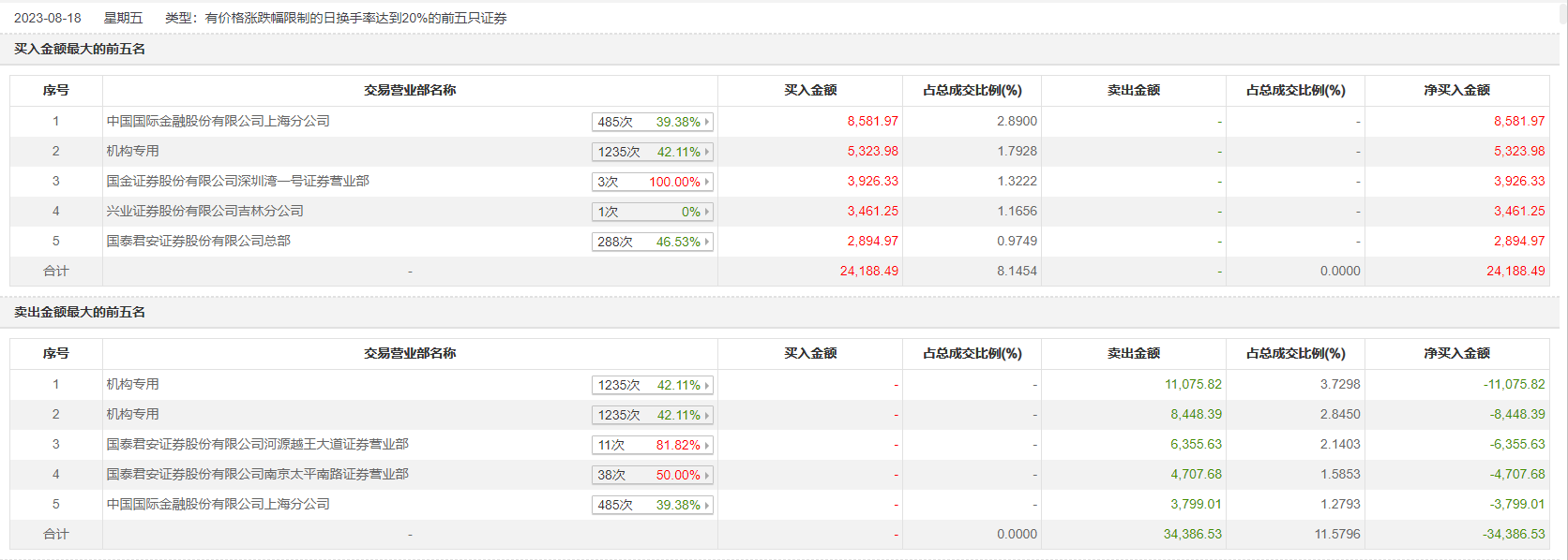 8月18日,信达证券今日跌8.6%,全天换手率达43.99%,振幅达10.98%。龙虎榜数据显示,营业部席位合计净卖出1.02亿元。其中,机构买入5323.98万元,卖出1.95亿元,合计净卖出1.42亿元。此外,国泰君安证券河源越王大道证券营业部、作手新一(国泰君安证券南京太平南路证券营业部)分别卖出6355.63万元、4707.68万元;中国国际金融上海分公司、国金证券深圳湾一号证券营业部分别买入8581.97万元、3926.33万元。