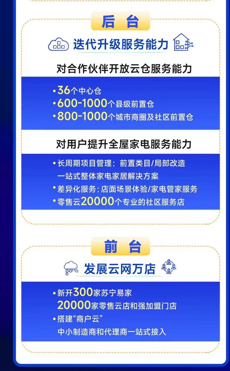 在服务进化方面,苏宁易购将升级两大服务能力。一是对合作伙伴的云仓服务能力。苏宁将对36个中心仓全面开放,建设600-1000个县级前置仓,提升消费者的服务响应能力,降低农村市场物流配送成本;建设800-1000个一二线城市商圈及社区前置仓,提升3C和生活电器的即时服务能力。二是对用户的全屋家电服务能力。苏宁将为用户提供一站式家电家居解决方案,零售云进一步发展专业的社区服务店,提升服务与体验能力。