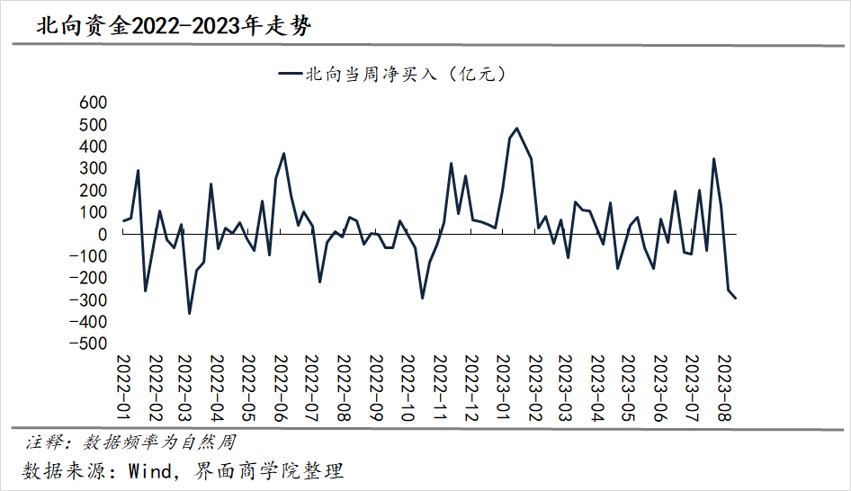 界面商学院曾在《北向资金是好的领先指标吗?我们发现了这些秘密》一文中对北向资金与A股重要指数的关系进行分析,并基于北向资金截至2023年7月21日的数据进行更新。在研究了自2016年7月以来的360个单周后,我们发现北向资金当周净流入与上证指数及沪深300指数当周涨幅呈中高度正相关,但是北向资金当周净流入与A股重要指数后续各区间涨跌幅的相关度较低,即北向资金单周净流入数据对指数后续走势的判断能力有限。