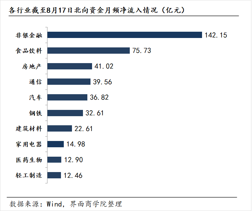 以申万31个一级行业为基准,Wind数据截至8月17日的月频申万一级行业数据显示,北向资金流入显著的前三板块分别为非银金融、房地产以及钢铁,月流入分别为110.39亿元、38.06亿元和29.83亿元。而北向资金撤出的前三板块分别为电子、银行以及计算机,月流出分别为81.36亿元、47.62亿元与33.36亿元。