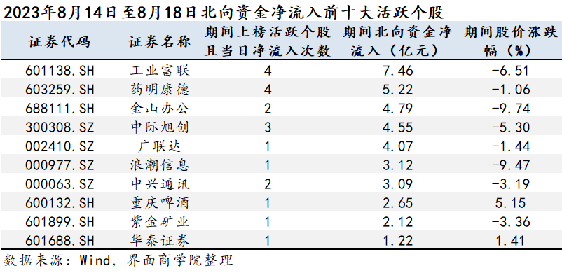 从北向资金活跃个股净流入金额上看,工业富联(601138.SH)、药明康德(603259.SH)、金山办公(688111.SH)为8月第三周北向资金净流入的前三。