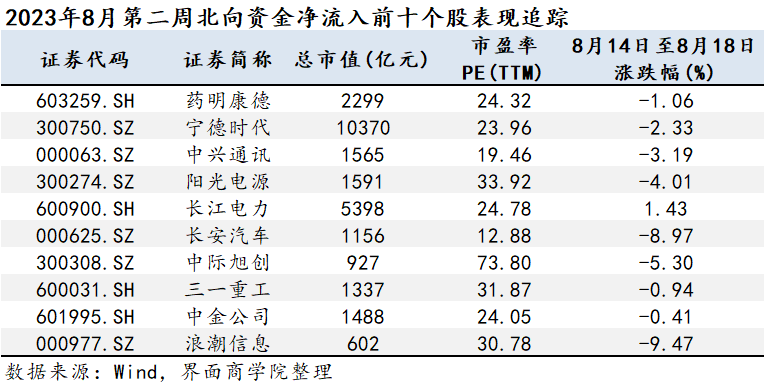 下图为上期2023年8月第二周北向资金净流入前十大个股的后续表现情况。数据截至2023年8月18日,追踪区间为2023年8月14日至8月18日。排序以上期资金净流入为基准。