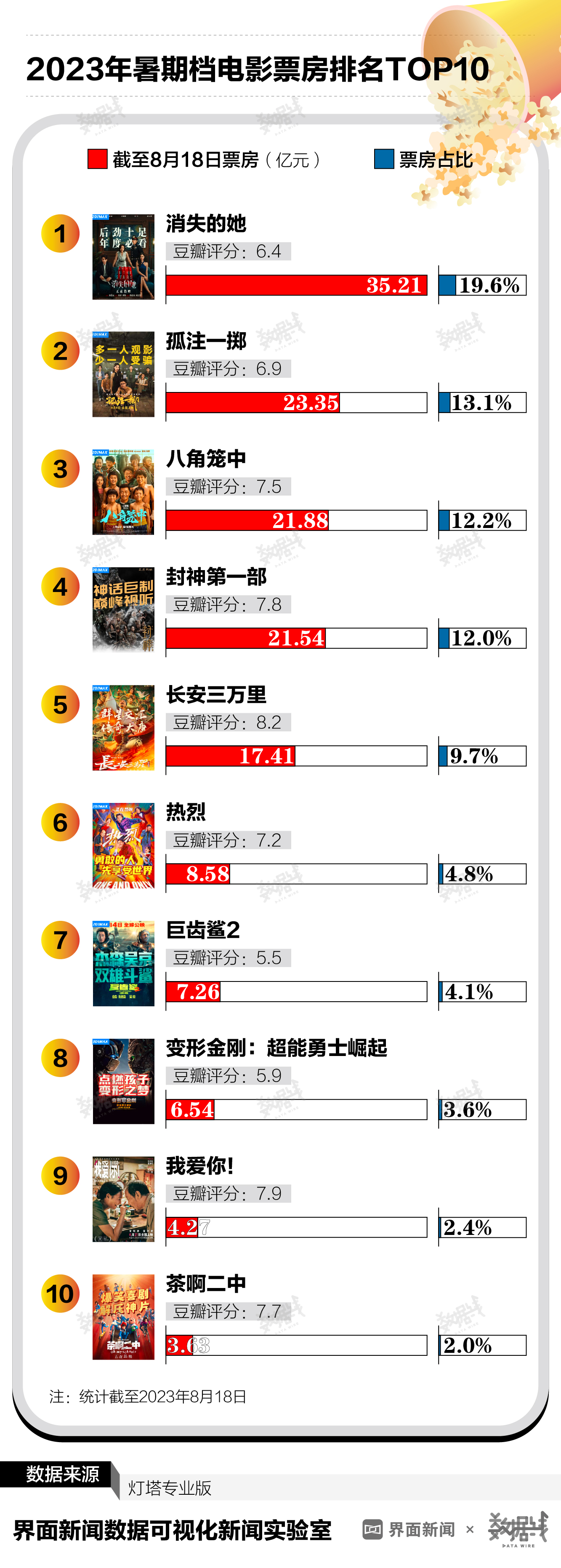 从票房排名来看,截至8月18日,《消失的她》总票房达到35.2亿元登顶榜首,在暑期档总票房中占比19.6%,《孤注一掷》、《八角笼中》分列二、三名。在票房榜前十名中,排名第五的《长安三万里》口碑最好,豆瓣评分达到8.2分,其次为《我爱你!》与《封神第一部》,评分分别为7.9分与7.8分。