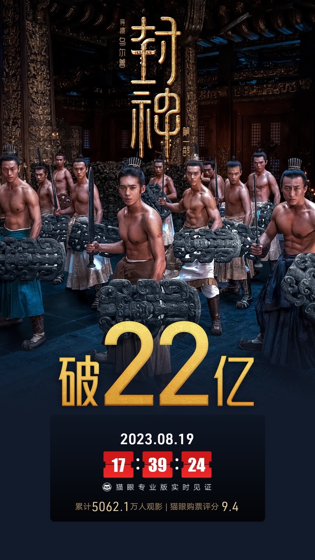 8月19日,据猫眼专业版数据,电影《封神第一部》总票房突破22亿元。