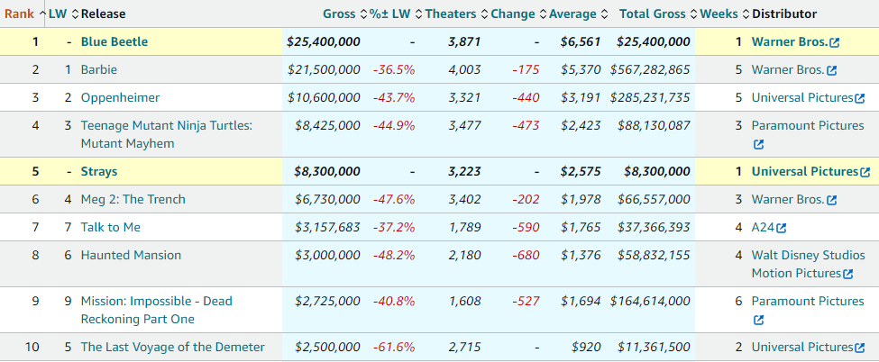 据票房统计网站Box Office Mojo 8月20日发布的电影市场数据,31部影片北美周末票房(18日至20日)报收约9713万美元,较前一周末下跌约13%。美国DC最新超级英雄电影《蓝甲虫》以约2540万美元首映周末票房拔得周末票房头筹,《芭比》以约2150万美元退居次席,《奥本海默》以约1060万美元票房排名第三。
