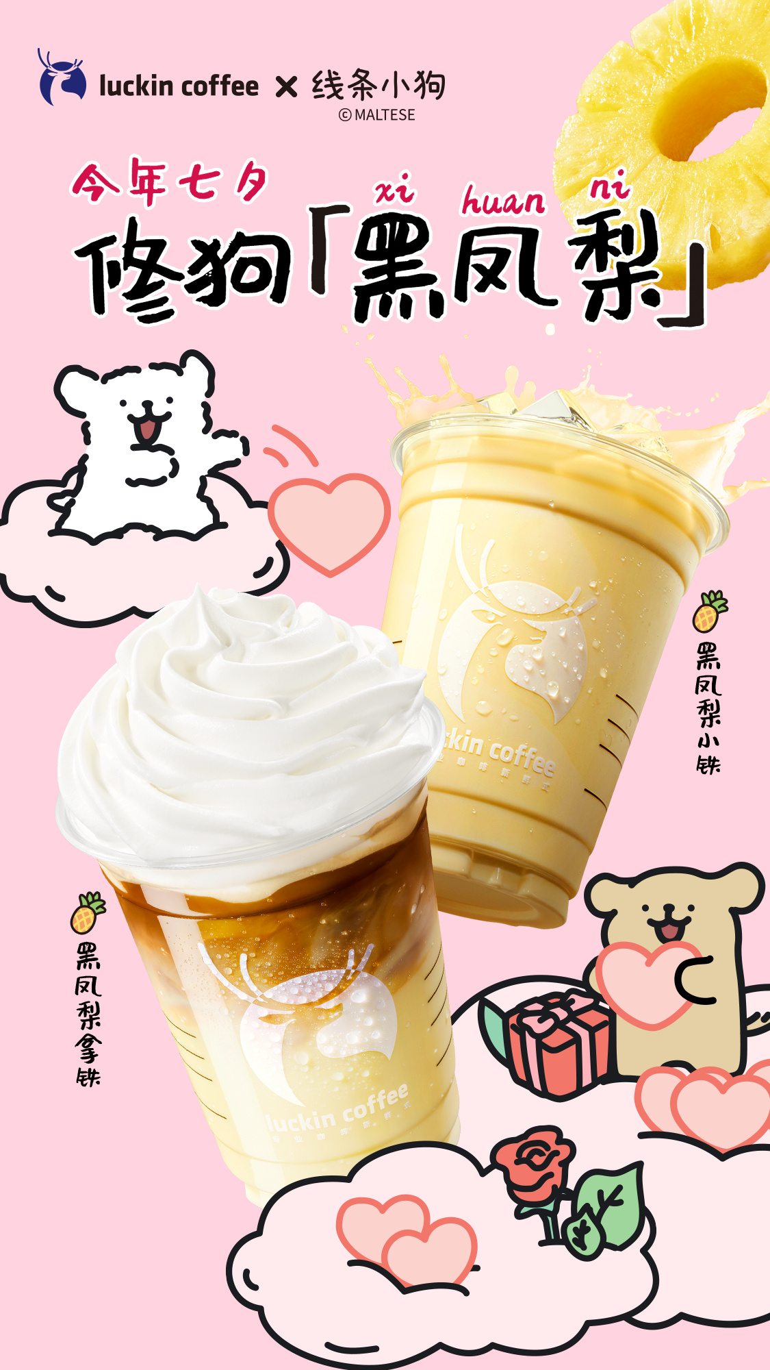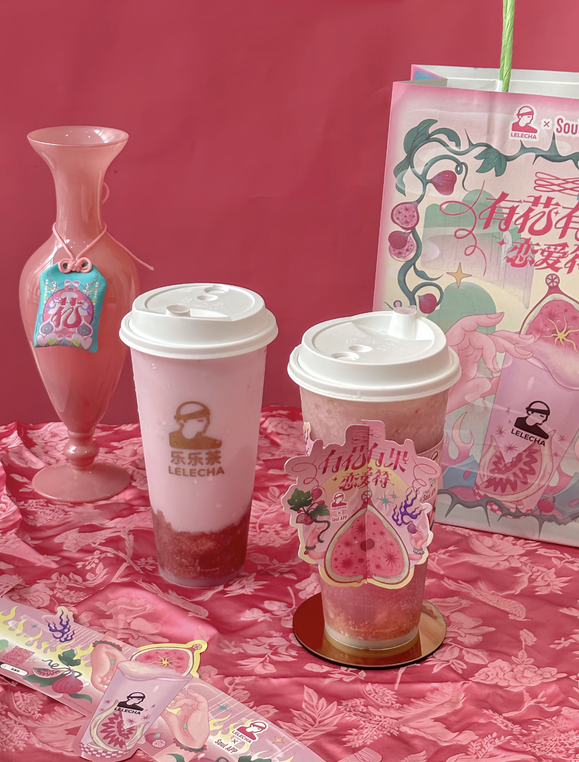 瑞幸二度续写《修狗爱情故事》,与线条小狗一起推出“修狗黑凤梨”系列,谐音粤语的“喜欢你”,衍生出贴纸、头像、卡牌等一堆周边;COCO都可联名玉桂狗,推出各式周边的新玩法;喜茶则找到方文山,搞了一波《天青雨》文案限定;乐乐茶联手社交软件Soul,在全场粉嫩到有些花哨的包装中推出“恋爱御守”;茶百道真鲜奶茶系列推出“执子之手”限定杯;挪瓦咖啡推出青蛙对戒,并与美宝莲联名产品桃桃冰冰拿铁,消费者下单抽奖就有机会获得美宝莲唇釉;奈雪的茶换上全粉包装,小程序点单套餐就有机会获得“粉你的心抱抱公仔”。