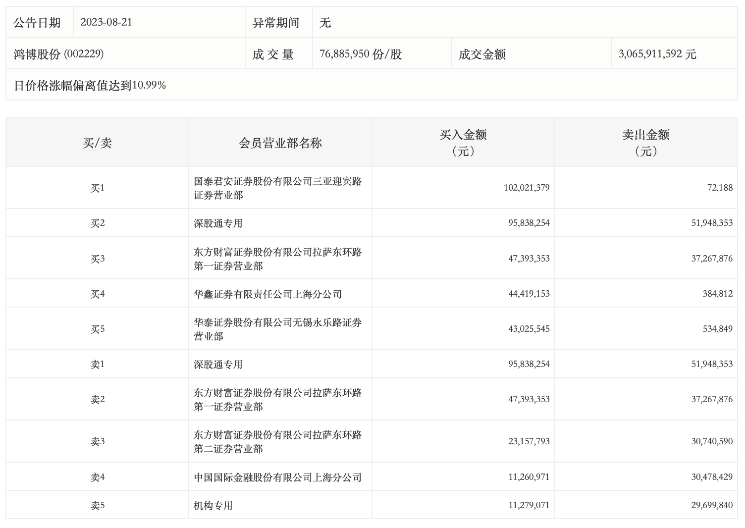 具体来看,机构买入1127.91万元,卖出2969.98万元,合计净卖出1842.08万元。此外,国泰君安证券三亚迎宾路证券营业部、深股通专用分别买入1.02亿元、9583.83万元;深股通专用、东方财富证券拉萨东环路第一证券营业部分别卖出5194.84万元、3726.79万元。