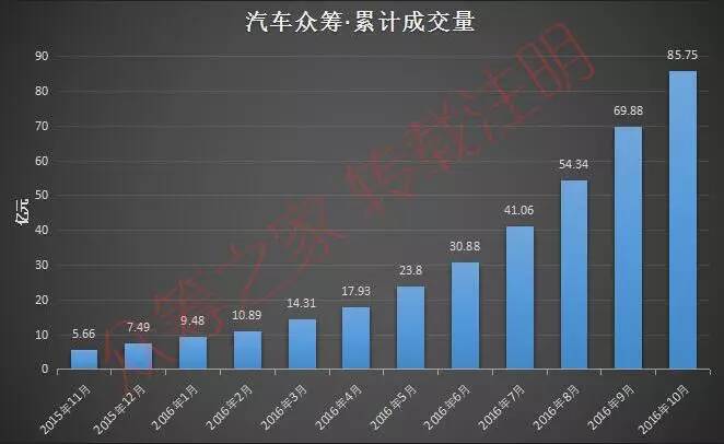 据第三方物筹平台统计,截至今年10月底,汽车众筹行业累计成交量达到85.75亿元。与2015年11月累计成交量5.66亿元相比,行业成交量翻了惊人的17倍。