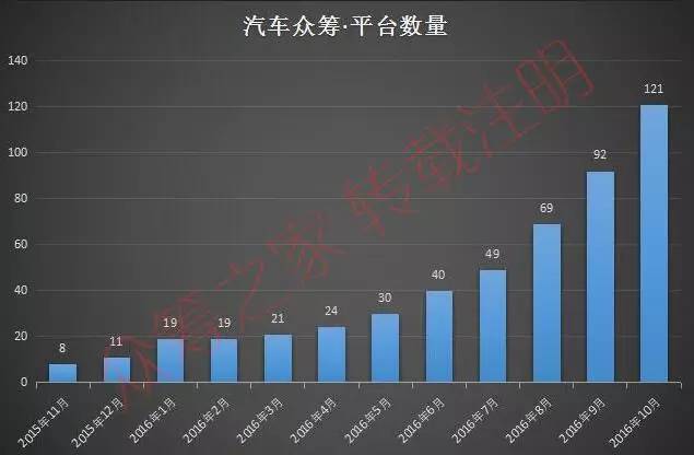 与之相对应的,还有汽车众筹平台数量增长。截至今年10月底,汽车众筹平台数量达到121家,与2015年11月平台数量8家相比,翻了14倍。从数据来看,现在平均每个月至少有20家平台成立。