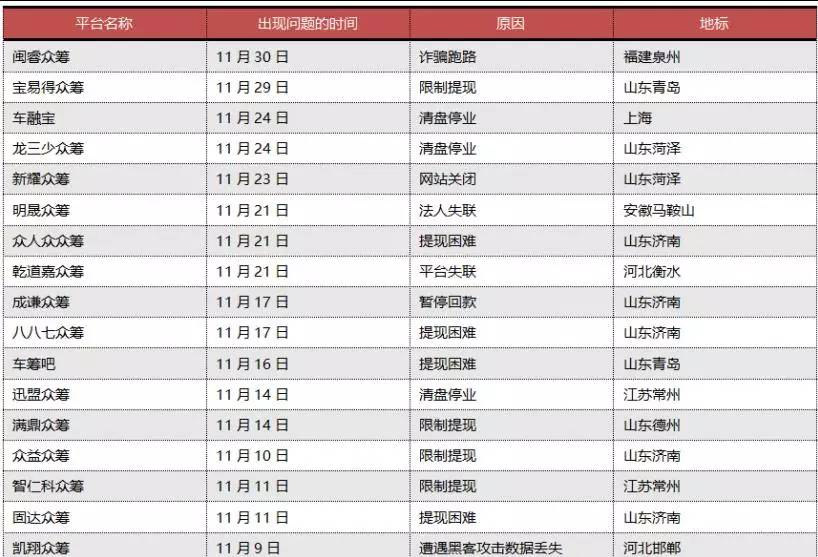 截至2016年11月底,汽车众筹行业出现停业、清盘、失联、提现困难等情况的平台共有52家。部分截图如下:
