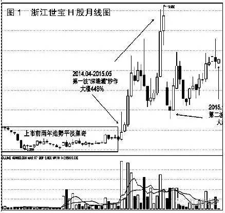 浙江世宝是一只同时在深、港两地挂牌的公司,过去数年内其A股和H股被作为“深港通”题材反复炒作,其中H股2011年3月先在香港上市,走势一直波澜不惊,和诸多内地在港上市的小公司一样,成交低迷、价格走弱,上市半年多股价便从4元港币附近下跌到2.06元,惨遭腰斩。此后两年多,浙江世宝的H股一直在2~3元的箱体里低位震荡,和A股的价差长期维持在5倍以上,最高甚至超过8倍,成为市场眼中的“价值洼地”。2014年4月开始,浙江世宝H股启动两波和“深港通”有关的炒作(图1),第一波从2014年4月到2015年5月,一年左右大涨448%;第二波从2015年10月震荡上行至本周,最大涨幅121%。