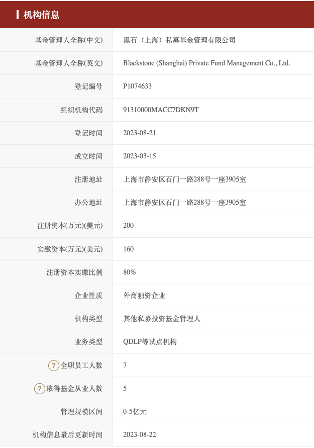 8月24日,据中国证券投资基金业协会信息显示,黑石(上海)私募基金管理有限公司于8月21日完成登记。公司业务类型:QDLP(合格境内有限合伙人)等试点机构。根据登记信息,任莹为该公司法定代表人、董事长,石思佳为总经理。