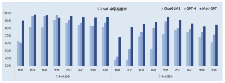 同时,在C-Eval的初高中的全科测试集合上,MathGPT的表现成绩也普遍高于GPT-4和清华团队推出的第二代中英双语对话模型ChatGLM2。