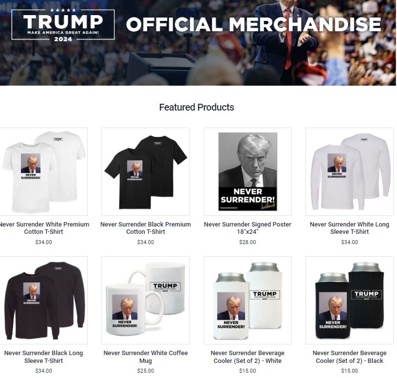 特朗普竞选团队推出的周边产品包括T恤、咖啡杯、杯托、贴纸、海报。产品上印有特朗普的投案大头照,配上“永不投降!”的大写字母标语。其中最贵的是T恤,34美元一件,分长短袖款;最便宜的是贴纸,12美元一张。