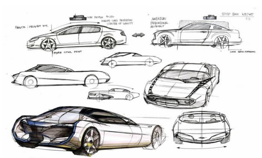 从我了解的汽车设计流程来看,首先要给市场定位,确定好目标人群。其次,设计师根据目标人群和车型,进行头脑创作,寻找一些对汽车风格有帮助的意向形态,接着根据这些意向进行汽车的设计(包括汽车的外观/内饰),在这个阶段,会有好几个设计师出不同方向的概念图,接着评审,评审完,选出1/2个方向进行深化,深化完,再评审,最终确定的方案,用Alias进行建模,然后不断调整数模,接着做油泥模型,最后做色彩纹理的选择以及材质分割。