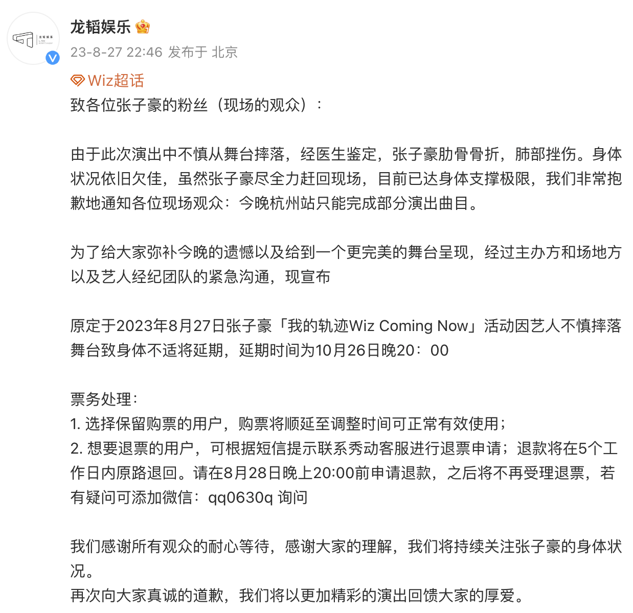 8月27日晚间,龙韬娱乐官博发布公告称,由于杭州站演出中不慎从舞台摔落,经医生鉴定,张子豪肋骨骨折,肺部挫伤。今晚杭州站只能完成部分演出曲目。经过主办方和场地方以及艺人经纪团队的紧急沟通,宣布原定于2023年8月27日张子豪“我的轨迹Wiz Coming Now”活动因艺人不慎摔落舞台致身体不适将延期,延期时间为10月26日晚20:00。选择保留购票的用户,购票将顺延至调整时间可正常有效使用。