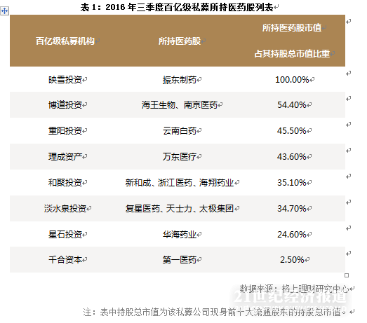 值得注意的是,重仓持有医药板块股票的私募中不乏一些知名机构,如淡水泉、博道投资、和聚投资等,其持有的医药行业个股均在2只以上。三季度私募机构持有的医药股总市值为444.17亿元,占私募持股总市值的10.21%左右,与医药板块占A股总市值的比例6.07%相比,私募机构已大幅超配医药板块。