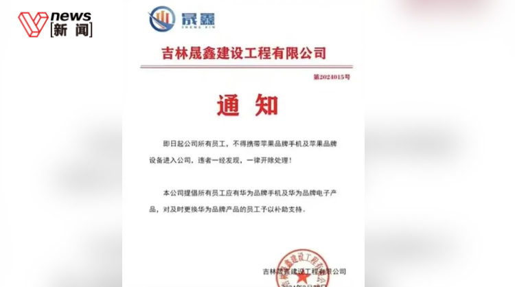 近日,网传吉林晟鑫建设工程有限公司发布的通知称,员工不得携带苹果品牌设备进公司,违者一经发现,一律开除处理。公司提倡员工使用华为品牌的手机及电子产品,对及时更换华为产品的员工予以补助支持。