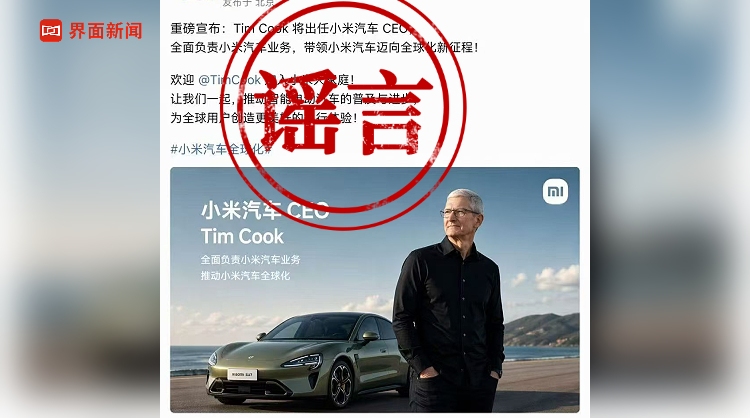 4月22日,“小米汽车”冲上社媒热搜,却是因为一张高仿P图。图片中小米公司“重磅宣布”苹果CEO蒂姆·库克将出任小米汽车CEO。图片甚至还伪造了蒂姆·库克的回应:“非常荣幸加入小米汽车!” 22日下午,小米集团董事长特别助理、战略市场部副总经理徐洁云发文回应:“乱P图不可取,可不兴这么乱开玩笑的。”